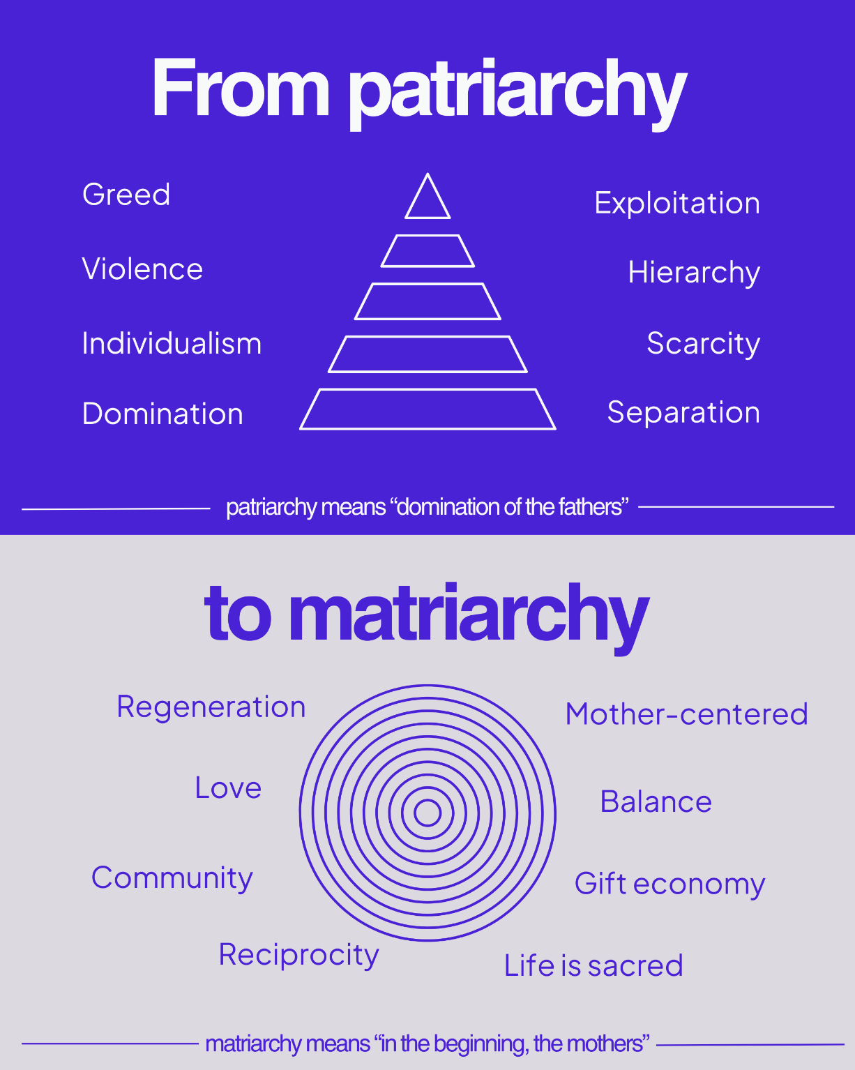 As you can see in these graphs I made, with the emphasis of information from Nergiz De Baere, the matriarchal structure is circular, which means it is communal, while the patriarchal structure is a triangle, which most westernized powers view as the correct structure within various ancient civilizations. The value of one ruler, and the centralization of men. The exploitation of land, women, and resources. This means the social system under a man is ant-nature, which optimizes society for whoever is on the top of the pyramid. Unlike the patriarchy, matriarchy values regeneration instead of exploration, love over dominance, reciprocity over greed and community instead of individualism.